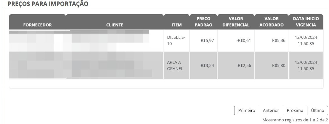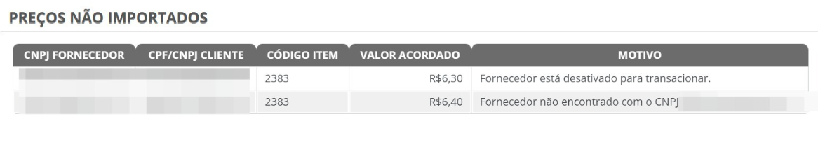 Será apresentado uma lista de preços que foi importado com sucesso (Preços para importação) ou que foi negado (Preços não importados), como mostra o exemplo abaixo: